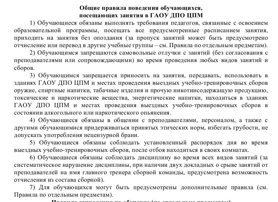 В соответствии с общими правилами поведения обучающихся, посещающих занятия ГАОУ ДПО ЦПМ в том числе и выездных учебно-тренировочных сборов, при нарушении организаторы имеют право отчислить команду в любой момент УТС.